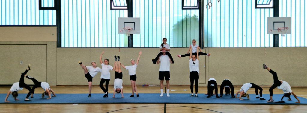 Unter der Leitung von Emely Becker mit tätkräftiger Unterstützung von Robin Günther, hatten die Schülerinnen (von links Edda, Leni, Kateryna, Ida, Yaren, Lisa, Meena, Marie, Amani, Huda, Sophie und Fadia) in den vergangenen Wochen intensiv geprobt – und der Einsatz hat sich gelohnt: Mit eleganten Hebefiguren, waghalsigen Sprüngen und perfekt abgestimmten Bewegungsabläufen zogen sie das Publikum in ihren Bann. Die Zuschauerinnen und Zuschauer – darunter die Schulleitung Frau Hofmann und Frau Krieger,  Eltern und Großeltern, Lehrkräfte, Mitschülerinnen und Mitschüler – zeigten sich begeistert und spendeten langanhaltenden Applaus.